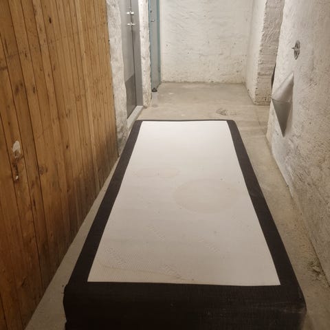 Säng och madrass. Rektangulär modell med mörka kanter. Ska även finnas ben till sängen