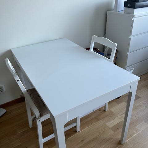 IKEA Melltorp matbord i vitt i bra skick. Fyrkantigt bord med vit bordsskiva och vita ben. Passar som matbord eller arbetsbord i kök, vardagsrum eller mindre utrymmen. Stomme och ben i metall med slät, lättskött skiva. Stolarna ingår också och är det okej skick. Nån av dem lite vinglig men helt okej.