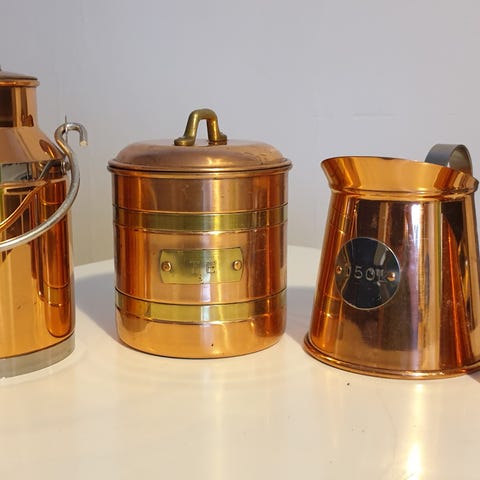 Set med tre kopparkärl i okänt märke. Består av en hink med handtag, en högre kanna/behållare med lock samt en gryta på tre ben med handtag på sidorna. Alla delar är i kopparfärgat metallmaterial och lämpar sig exempelvis som inredningsdetaljer eller dekoration. Eventuella åldersspår och patina kan förekomma.