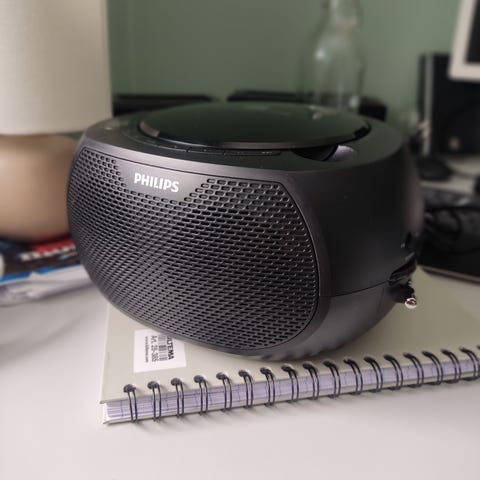 Philips CDR 775 CD-inspelare och CD-spelare i svart design. Enheten har två CD-fack, ett för uppspelning och ett för inspelning, med frontmonterade knappar för att styra båda sektionerna. Displayen i mitten visar spårinformation och inställningar. Bilderna inkluderar originalfjärrkontroll och bruksanvisning. Lämplig för anslutning till en vanlig stereoanläggning via analoga ljudutgångar. Lämplig för uppspelning av vanliga ljud-CD-skivor och inspelning till CD-R/CD-RW, beroende på kompatibla skivor.