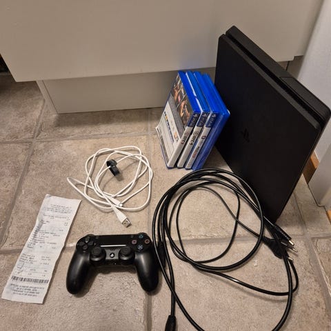 Sony Playstation 4 spelkonsol i svart färg med två trådlösa handkontroller. I uppsättningen ingår olika samtliga kablar samt ett laddstativ för handkontrollerna. Flera Playstation 4-spel följer med, i originalfodral.