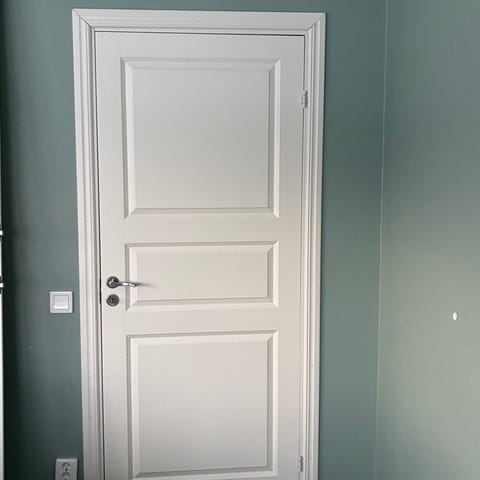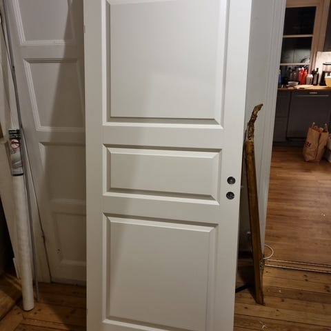 Vit innerdörr med klassisk spegelindelning. Dörren har slät yta med tre nedre speglar och en större övre spegel. Standard dörrhandtag Passar som innerdörr i bostad, exempelvis till sovrum, vardagsrum eller hall. Exakta mått och hängning behöver kontrolleras mot befintlig karm vid montering.