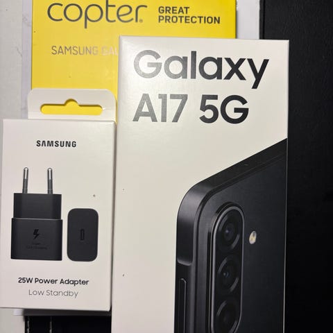 Kartong, mobil, hörlurar och laddare+ kabel