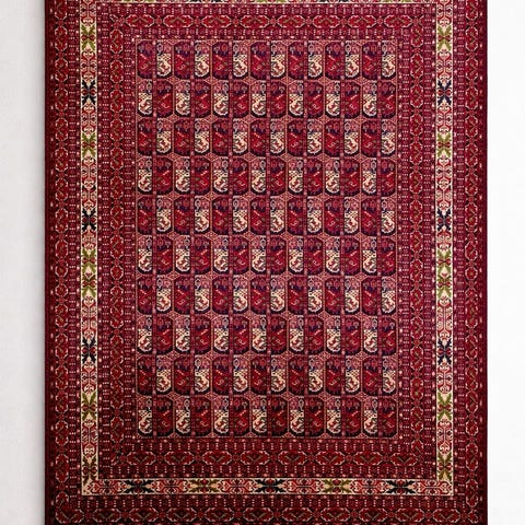 Handknuten matta i ull med ett blommigt mönster. Mattan har en gråblå bottenfärg med detaljer i flera färger. Fransar finns i mattans kortsidor. Mått 181x125 cm. Finns i Stockholm