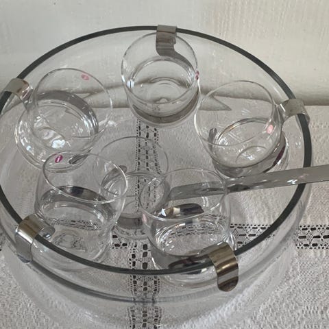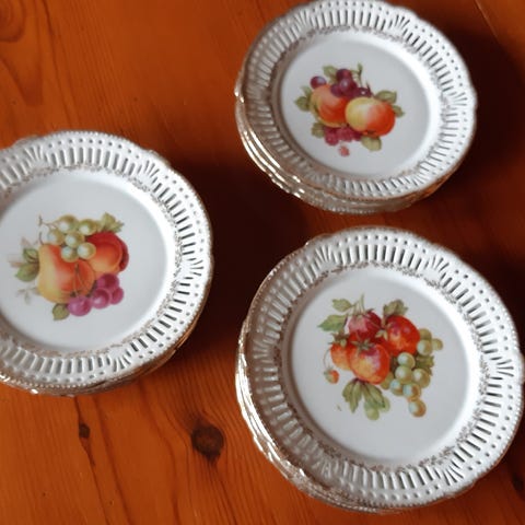 Serveringsfat i sektioner i vitt porslin med blommönster. Består av flera lösa skålar som bildar ett runt fat, samtliga med lock och knoppar. Skålarna står i en rund metallställning.