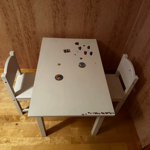 Finns några klistermärken men lådorna kan vändas eller så skrapar man bort dem.