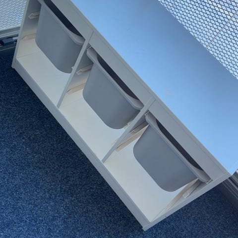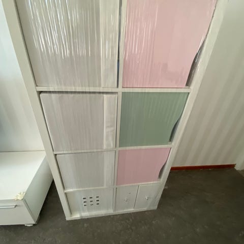 IKEA förvaringshylla barn med plastlådor vit grön rosa