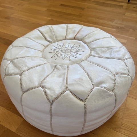 Köpt nere på Österlen för några år sedan. Mäter ca 60 cm hög, 100 cm i diameter. Ytan är av läder. I botten kan den öppnas med dragkedjor om man så önskar. Köptes för 3900 kronor, säljes för 1800 kronor eller högstbjudande.