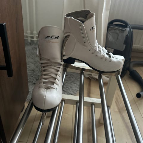 Storlek 36. Klassisk modell med högt skaft och snörning för stabilitet runt fot och ankel. Blad i metall med taggar framtill, märkta GS 240. Passar för konståkning och allmän åkning på is,