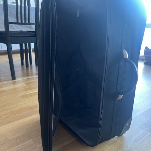 Fin Db med hjul, utdragbart handtag att dra med. Handtag på sidor för att kunna bära. Fint skick o rymlig. Aldrig flugit med. Bara bilbagage. Färg grå.