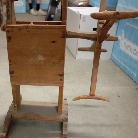 Vedförvaring på hjul. Lådan är öppen framtill och uppbyggd av ribbor som ger god ventilation för veden. Passar för förvaring av ved inomhus, exempelvis vid kamin eller eldstad. (Handgjord)