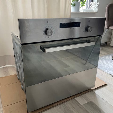 Ikea Nutid OV9 inbyggnadsugn med pyrolys och varmluftsfunktion. Ugn i rostfritt utförande med glasfront och integrerat handtag. Invändig ugn med fläkt för varmluft, ugnsbelysning, plåtar och galler. Passar för inbyggnad i köksskåp enligt standardmått. Manual för modellen Nutid OV9 finns med på bild.
