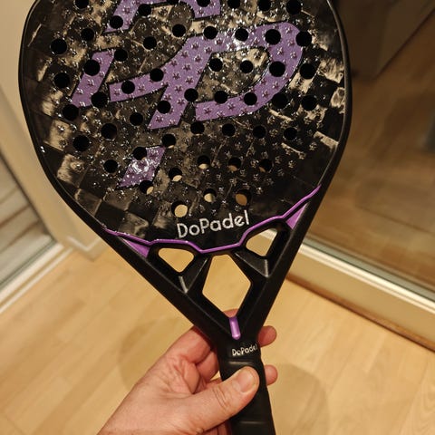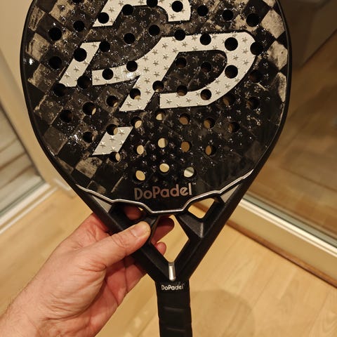 Mycket trevligt rack från DoPadels senaste kollektion, bra vikt: 362 g med grundlinda + en overgrip. Racket är i nyskick då det endast är spelat med i 3x90 min.