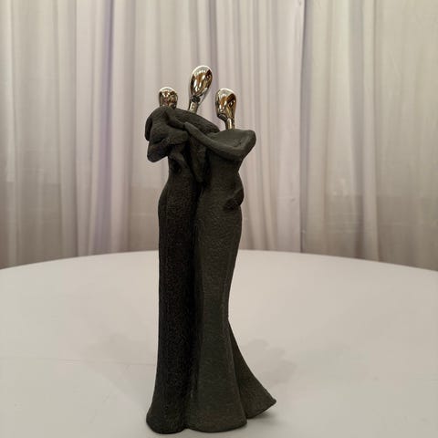 Skulptur föreställande en sittande figur i lång klänning. Kroppen är i grått material med lätt strukturerad yta och huvudet är silverfärgade, vilket ger en tydlig kontrast. Passar som inredningsdetalj på exempelvis hylla, sideboard eller bord. H 17 cm x B 26 cm x D 9 cm