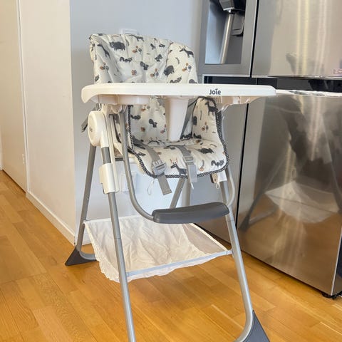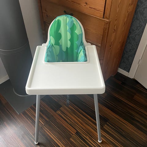 Matstol för barn med avtagbar bricka och vadderad dyna med skogsmotiv. Stolen har bälte för att hålla barnet på plats och metallben för stabilitet. Passar för matstunder i hemmet och kan användas vid ett vanligt matbord. Dynan är mönstrad med träd och djur i flera färger. I bra skick förutom fläckar på tyget som borde tvättas.