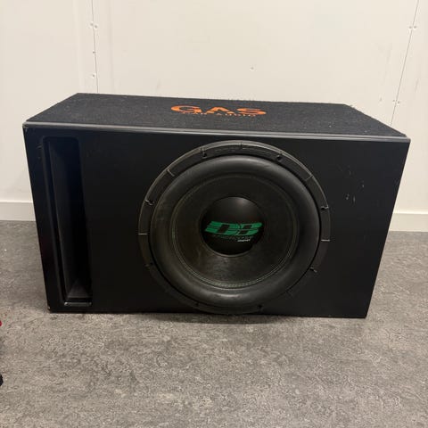 JBL baslåda med inbyggt slutsteg för bilstereo. Lådan är klädd i svart tyg och har rund subwoofer monterad på framsidan. På baksidan sitter ett slutsteg med anslutningar för högtalarkablar, RCA-ingångar och strömanslutning. Lämplig för montering i bagageutrymme i bil för extra basåtergivning i ljudsystemet.