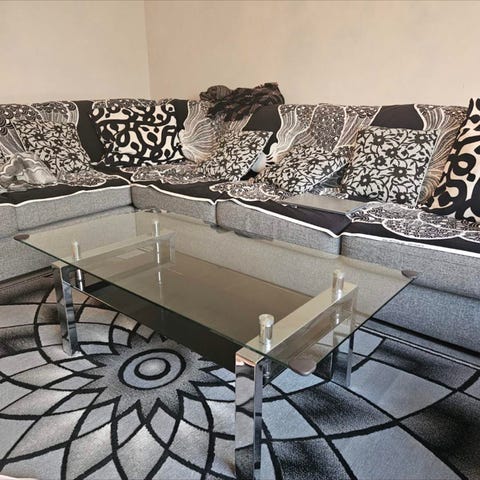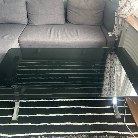 Säljer ett fint soffbord med glasskiva och kromat underrede.