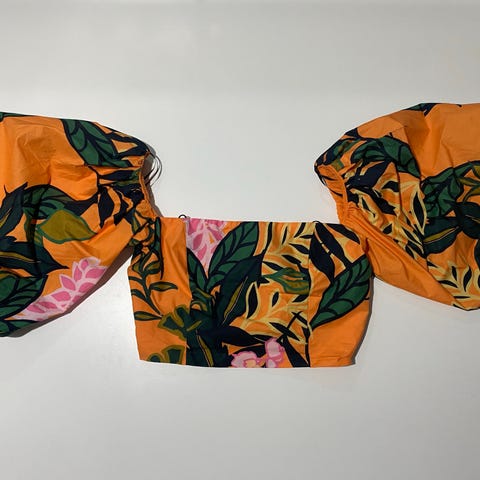 Säljer en orange kjol med tropiskt mönster i gröna och rosa toner. Volang nedtill ger fin form och rörelse. Lätt bomullstyg – sval och perfekt för varma dagar.