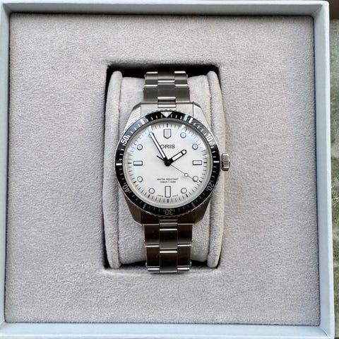 Klockan är inköpt i april 2024. Garantitiden är 10 år. (2 år + ytterligare 8 år vid registrering av klocka på Oris hemsida). Originallåda med instruktionsbok, extra länkbitar, tags som satt runt klockan vid köp och verktyg för armbandsbyte medföljer, samt givetvis även kvitto och garantikort.