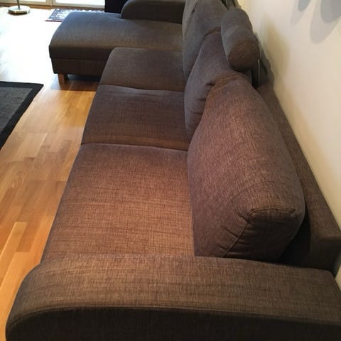 Grå fåtölj och fotpall inköpta på mio.