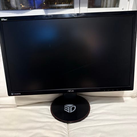 Det är en asus vg248qe 24tum 144hz 1ms 1920x1080 full hd skärm. Skärmen går enkelt att justera åt alla håll för bekväm upplevelse. Allt fungerar. Skärmen har Inbyggda högtalare, ingång för hdmi, dvi och displayport.