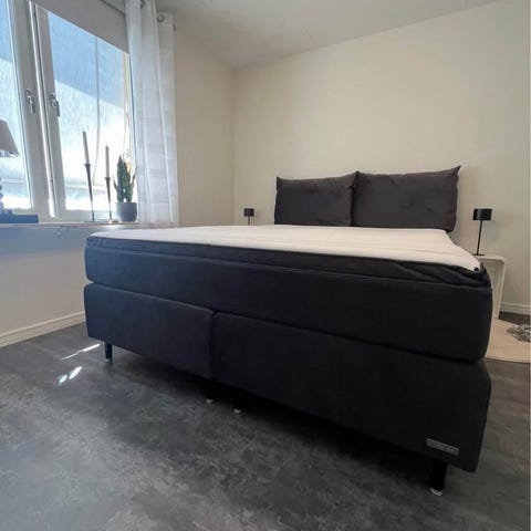 Jensen säng med madrass i svart/grå utförande. Sängen har en tygklädd underdel med ficka på sidan för förvaring av kontrollen till el manövreringen.