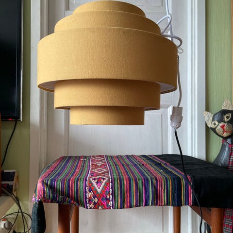 Vacker Taklampa i tunn genomskinlig textil. I nyskick! Höjd 20cm, diameter 50cm.