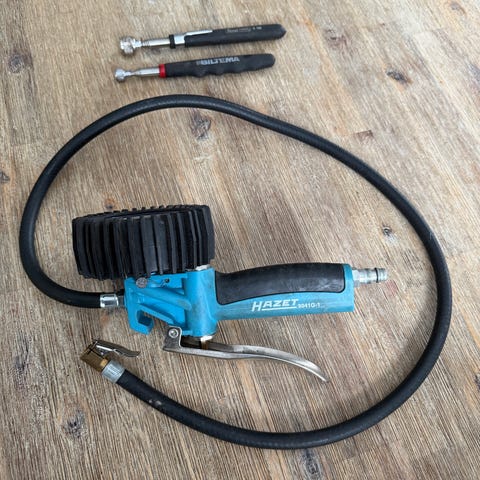 Kompressorn levereras med 2 st blå 10m slangar, 2st spiralslang samt tryckluftsverktyg, bland annat 1 st däckpåfyllare med manometer, 1 st sprutpistol, 2st tryckluftspistoler, 1st slipmaskin och 1st kapmaskin.