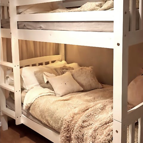Sängen är använd både som vanlig enkel säng med ben och gavel samt som botten i en våningsäng.