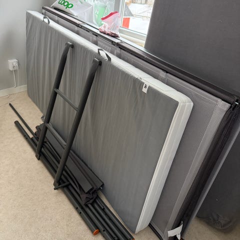 Båda är i tvättbehov men hela! Har enbart använt resårbotten med det gråa överdraget men såg under att det behövs en rengöring. Bäddmadrassen går klädseln att ta av och köra i maskin.