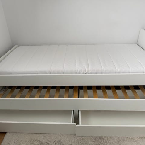 2 stycken Ilva säng med vit madrass. Sängen har ryggstöd och gavlar samt förvaring i form av utdragslådor undertill. Madrassen är vit med quiltat överdrag. Passar som enkelsäng i sovrum eller barnrum. Mått 90x200. Båda har varsin sidoskydd,