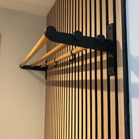 Skick: Bra. Lite synligt använd på trästängerna upptill, men det syns knappt när den sitter monterad på väggen. Skruvarna måste dras åt och en skruv till en av krokarna saknas – enkel att ersätta. Se bilderna!
