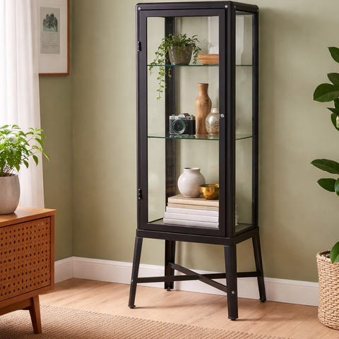 Svart vitrinskåp i plåt med dekorglas, MIO
