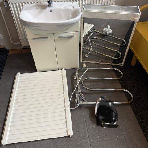 Spegelväggskåp, spegel badrum, skjutdörrar glas och trä, lampa, badrumsbelysning