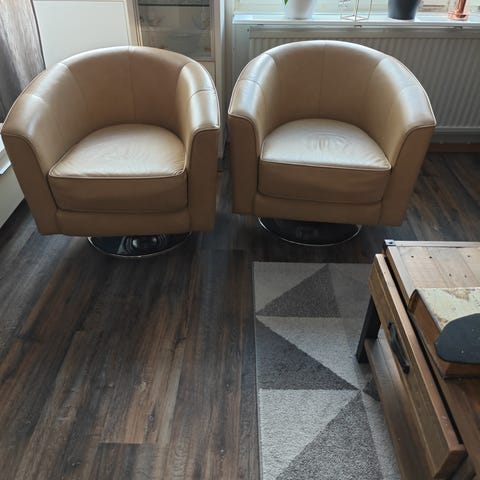 Svängbara och går att fälla bakåt i liggläge. Skinnet i mycket bra skick, regelbundet behandlat. (Rengöringsmedel medföljer) En fåtölj Medium, den andra Small. Ekunderrede.