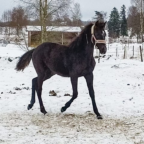 Vår lille Nugget är redo för sitt nya hem. Född den 5 juni 2025. Han har fullständiga amerikanska papper. Den här lille killen är nyfiken och älskar att bli gosad. Han är van vid att få sina hovar hanterade, gå på promenader, traktorer, bilar, vägar, hundar, etc. Han kommer att bli cirka 150 cm lång. Utmärkt stamtavla. Två europeiska mästare finns i hans stamtavla.