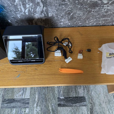 Mirror link. I förpackningen ingår bilskärmen, kablar och tillbehör för montering och anslutning. Skärmen är tänkt att användas som hjälpmedel vid körning för att visa kartor, ruttinformation och mediauppspelning.