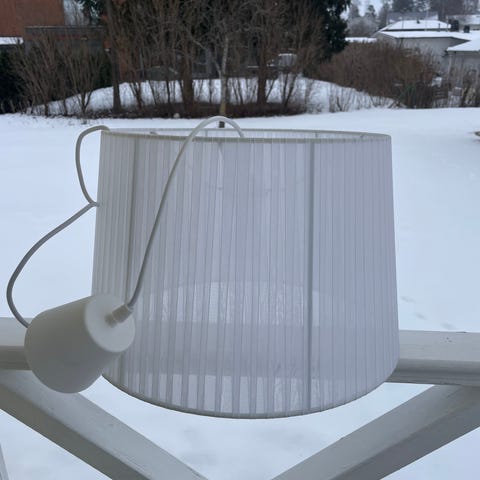 Taklampa med cylindrisk tygskärm i vitt med svart mönster. Skärmen har blommigt och organiskt tryck och är fäst i taket med metallupphängning. Passar som allmänbelysning i exempelvis vardagsrum, sovrum eller matsal. Används med standard glödlampa eller LED-lampa med passande sockel (ej inkluderad om inget annat anges).