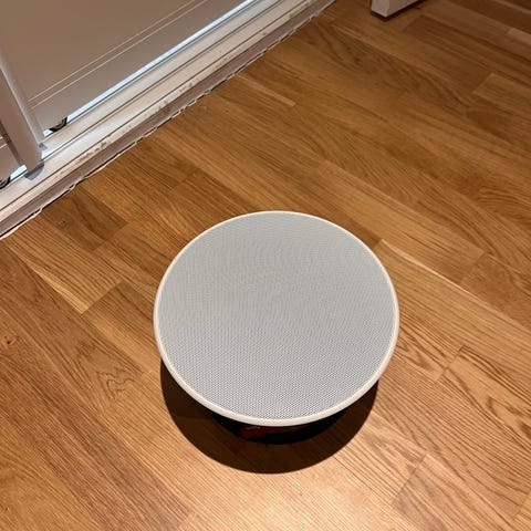 Det svarta tyget på framsidan av högtalaren är helt nytt (original från B&O). Logitech-enheten på bilden är en separat Bluetooth-mottagare som kan användas för trådlös anslutning till högtalaren.