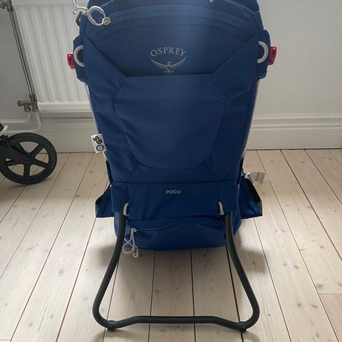Osprey Poco Premium bärstol/barnbärstol i svart och grått. Modellen är utformad för att bära barn på ryggen vid promenader och vandring. Bärstolen har justerbart bärsystem med vadderade axelremmar och höftbälte, samt ventilerad ryggpanel i mesh för ökad komfort. Sitsen för barnet är vadderad och har säkerhetssele. Det finns flera fack och fickor för förvaring av mindre saker och tillbehör. Passar för utomhusbruk och längre turer där barnet behöver kunna sitta bekvämt och säkert.