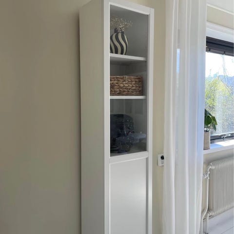 Säljer ett stilrent IKEA BILLY vitrinskåp med OXBERG glasdörr i vitt.