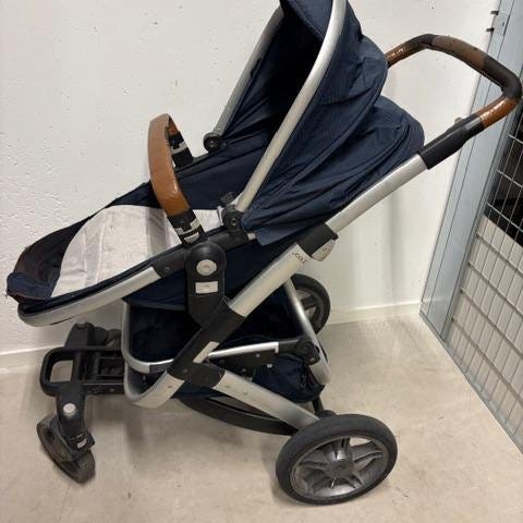 Joolz barnvagn med både liggdel och sittdel i blå textil. Vagnen har inte stabilt chassi med större bakhjul och svängbara framhjul. Liggdel med madrass ingår för spädbarn, och sittdel med sufflett och sele för större barn.