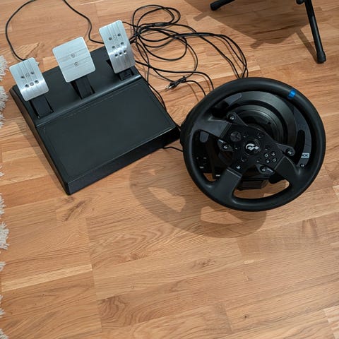 Sitter en 35 cm riktig aftermarket race ratt som ger riktigt realistisk känsla. Den känns fantastisk till drifting och rally (Det är det jag kört).