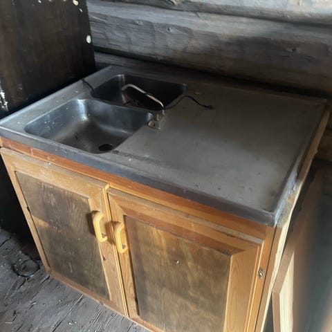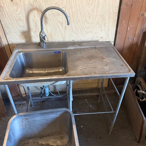 Rostfri diskbänk på ben med lådor, gallerlådorna har rostat lite, blandare på (oklart skick), stått I stall, se skick på bilderna.