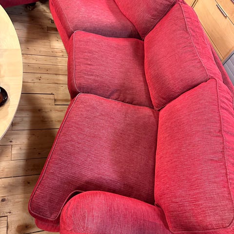 Bekväm Deluxe röd vin sammet tyget Soffa 3-sits i fint skick, ingen fläckar eller skador och felfri , fräscht och ren , djur och rökfritt , avtagbar tvätt klädsel på dynor och vändbara dynor även. Perfekt för vardagsrummet.