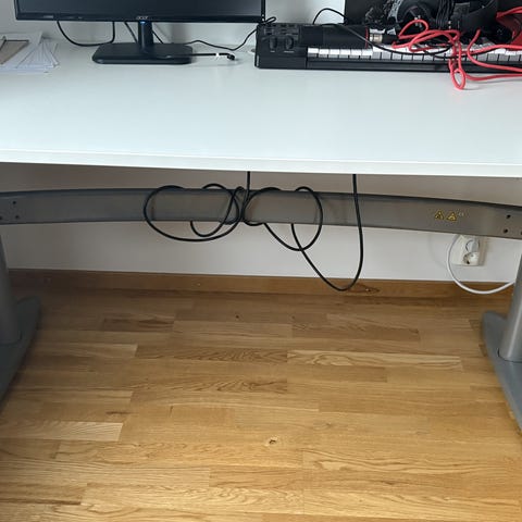 Skrivbord med elektrisk höj- och sänkbar funktion. Bordsskiva i ljust träutförande och ben i metall med T-stativ. Under bordet finns kabelränna för enkel kabelhantering. Passar som arbetsbord eller skrivbord i kontor eller hemmamiljö.
