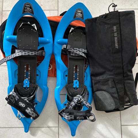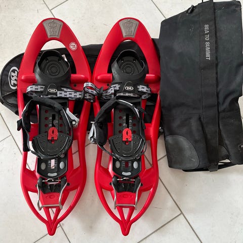 TSL 226 Escape Easy snöskor i grå plast med justerbar bindning. Undersidan har integrerade taggar och greppzoner för bättre fäste på snö och is. Modellen har hällyft för enklare gång i uppförsbackar. På bilderna syns även ett par svarta damasker från Sea to Summit stl L som ingår i utrustningen. Passar för vintervandring och turer i djupare snö.
