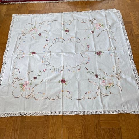 Broderad duk i vit textil med broderat blommönster i en cirkel. Broderiet består av små blommor i lila och orange med bruna slingrande rankor. Passar som bordsduk eller dekoration på mindre bord eller sidobord. Materialet är ett vävt tyg med tydlig struktur. Storlek är inte angiven men duken är fyrkantig enligt bilden.