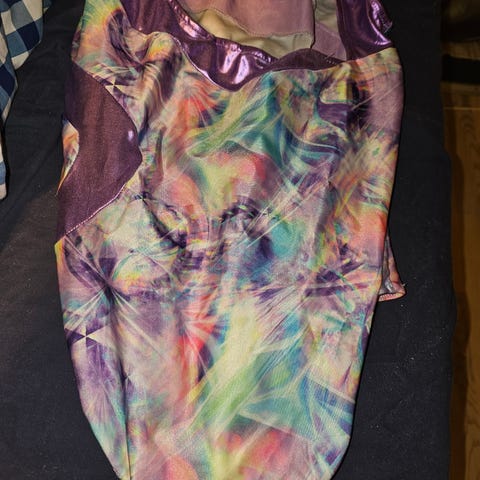 Dansdräkt/gymnastikdräkt för barn i storlek 164. Hel modell utan ärm med flerfärgat mönster i lila, rosa och blått samt dekorstenar framtill. Passar för dans och liknande träning eller uppvisning.