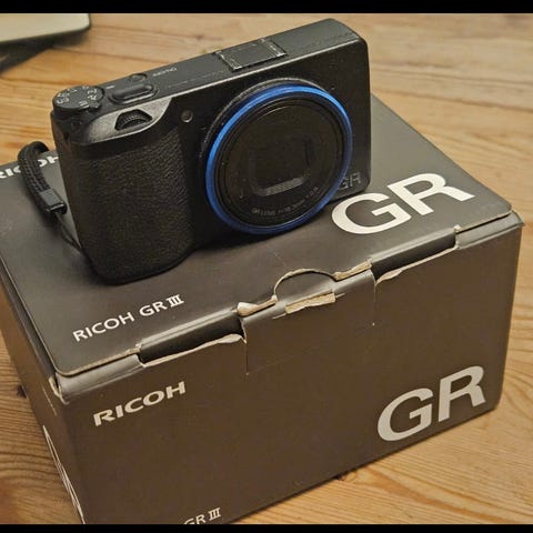 Ricoh GR IV (senaste versionen) inköpt hos Scandinavian Photo i november, sparsamt använd. 786 exponeringar. Väldigt bra kamera som jag känner att jag tyvärr använder för lite.